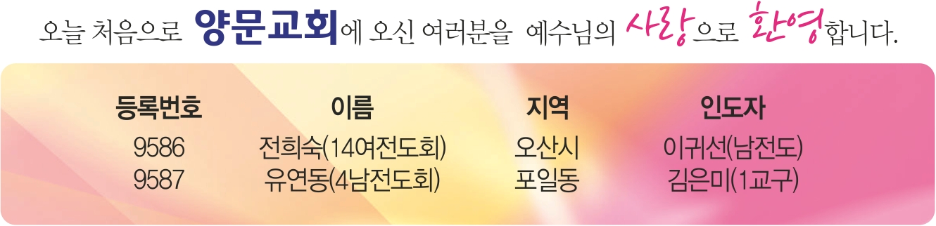 3. 양문 성경공부(1차)가 오늘부터 4월 22일까지 매주 주일 교육관 2층 예배실에서 있습니다.