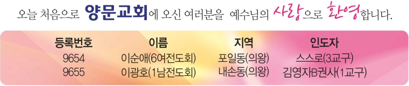 9. 5, 6월 새벽기도자 명단이 게시판에 게시되었습니다. 새벽기도자는 반드시 기도자석에 앉아주시기 바랍니다.