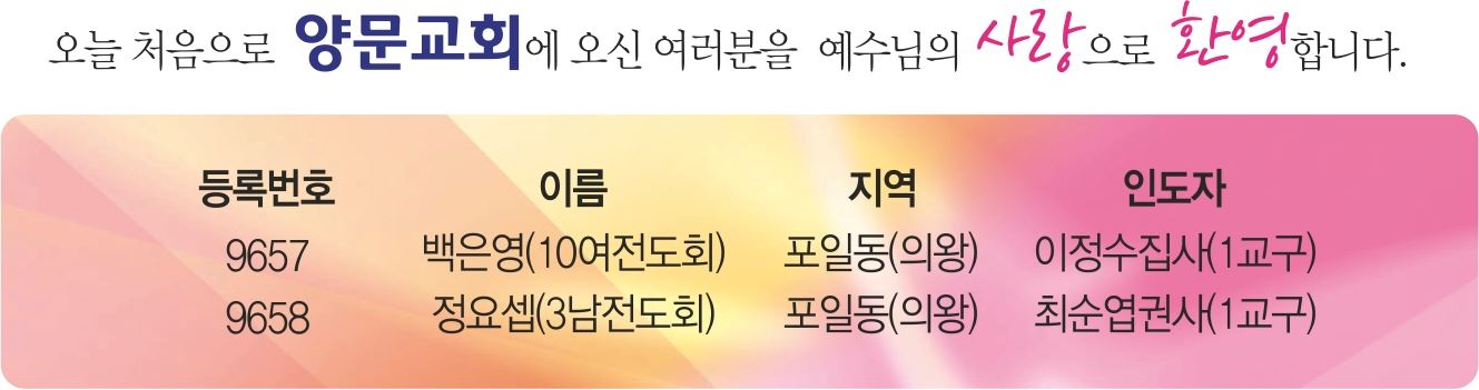 3. 오늘 2부예배 후 제직회의가 있습니다. 모든 제직들은 참석해 주시기 바랍니다.(장로, 권사, 안수집사, 집사, 권찰)