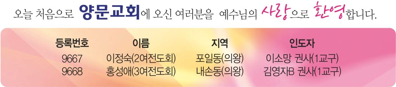 4. 양문 성경공부가 8월 6일(화)부터 8주 동안 매주 화요일 저녁 7시 50분부터 9시까지 2층 소망관에서 있습니다. 신청서는 1층 사무실에 비치되어 있으며 7월 21일(주일)까지 신청해주시기 바랍니다. 선착순으로 20명만 접수받습니다.(게시판 참조)