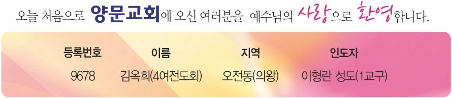 4. 다음 주일(10월 6일) 2부예배 후 학습, 세례, 입교식이 2층 믿음관에서 있습니다. 기도로 준비해 주시기 바랍니다.(게시판 참조)