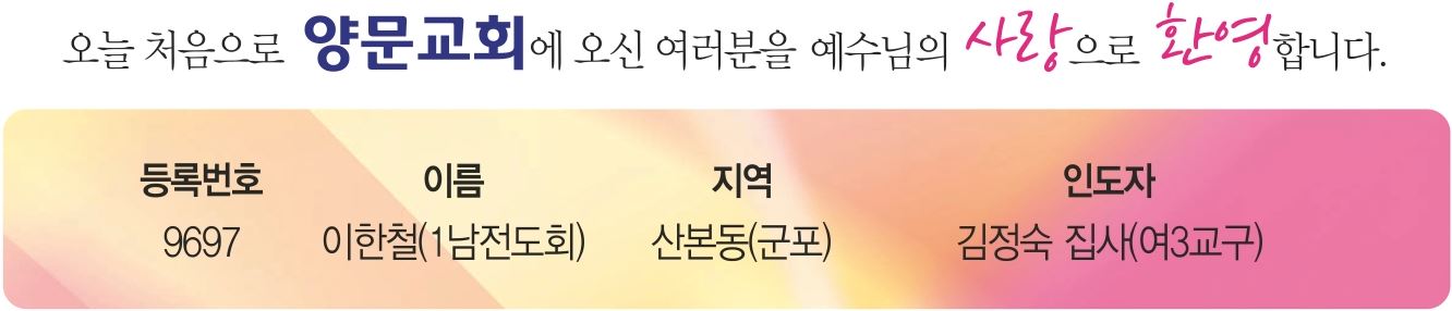 1. 2월은 ‘순종실천의 달’입니다. 2. 안수집사 세미나가 오늘 오후 3시 30분부터 5시까지 교육관 2층에서 있습니다. 전원 참석 바랍니다. 3. 교사 세미나가 2월 16일(주일) 오후 12시 30분부터 1시 30분까지 2층 소망관에서 있습니다. 교사와 교사에 관심 있는 분들은 참여해 주시기 바랍니다. 4. 나라와 민족을 위해 기도할 때입니다. 성도님들은 새벽을 깨워 기도하시기 바랍니다.